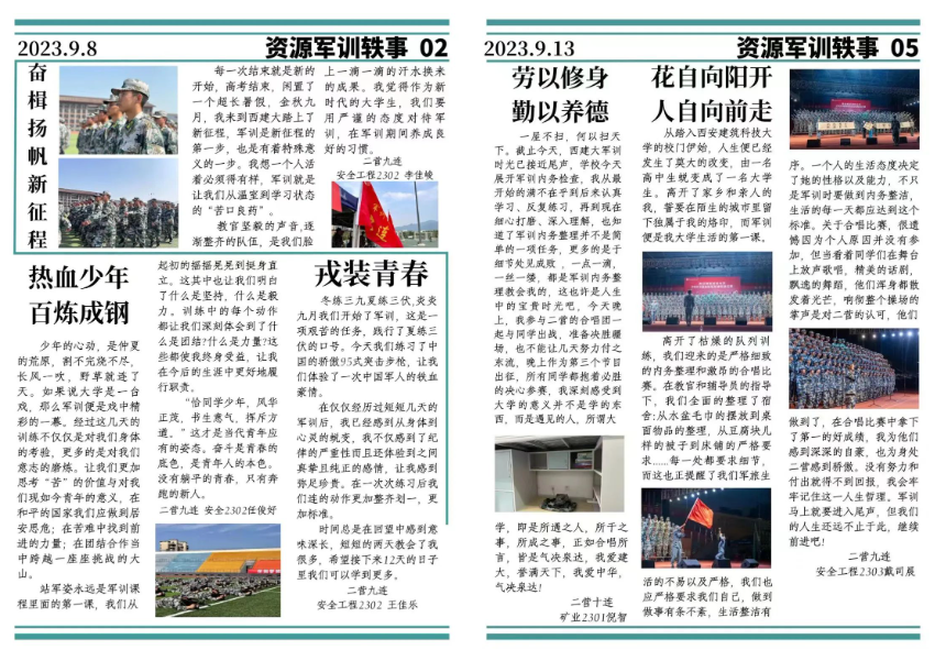 铿锵的誓言,是青春的赞歌;艰苦的训练,是身体素质与心理素质的双重考验,是自我精神和团队意识的绝佳磨炼。教官的悉心指导,同学们响亮的口号、整齐的方阵,构成了操场最亮丽的风采。军训日常的训练从刚开始最基础的队列训练,到最终以方阵形式带来的精彩会操,都展示出资源学子良好的精神风貌,各位同学们团结一心、严守纪律,收获颇多。