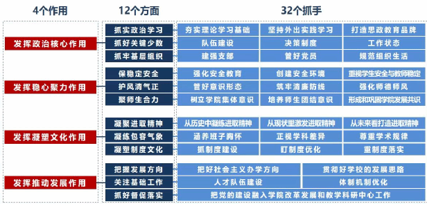 以“围绕发展抓党建、抓好党建促发展”为工作理念,结合快猫短视频 办学实际和发展现状,形成了“强核心、保稳定、塑文化、促发展”的党建工作思路,构建了“4+12”党建工作体系,即以政治核心、稳心聚力、凝塑文化、推动发展4个作用发挥为着力点,聚焦12个方面重点任务,抓实32项具体工作。