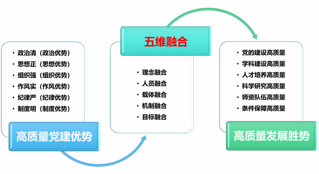 从理念、人员、机制、载体、目标五个维度入手,探索建立“深度融合、协同发展”工作机制,初步实现了党建与业务互融共促、双向奔赴的工作局面。在理念融合方面,强调政治统领发展,明确高质量党建与快猫短视频 高质量发展的辩证统一关系,在业务工作中进一步加强党的领导,确保党的领导更加坚强有力;在人员融合方面,通过党政干部交叉任职、双向交流,党建队伍与业务骨干双向培养、多维考核,锻造一支政治素质过硬、工作经验丰富、业务能力突出的干部队伍;在机制融合方面,严格落实“第一责任人”职责和“一岗双责”责任,坚持党建与业务同谋划、同部署、同推进、同考核,发挥系统协同效应;在载体融合方面,将党支部建在教学系和科研团队,通过课程思政、育人品牌活动及“党建+教学、党建+科研、党建+人才”等模式,确保“两个作用”发挥更加充分。在目标融合方面,树立“快猫短视频 高质量发展目标=高质量党建+高水平办学”理念,将党的建设贯穿于学科建设、人才培养、师资队伍、科学研究等中心工作,引领实现快猫短视频 高质量发展目标。