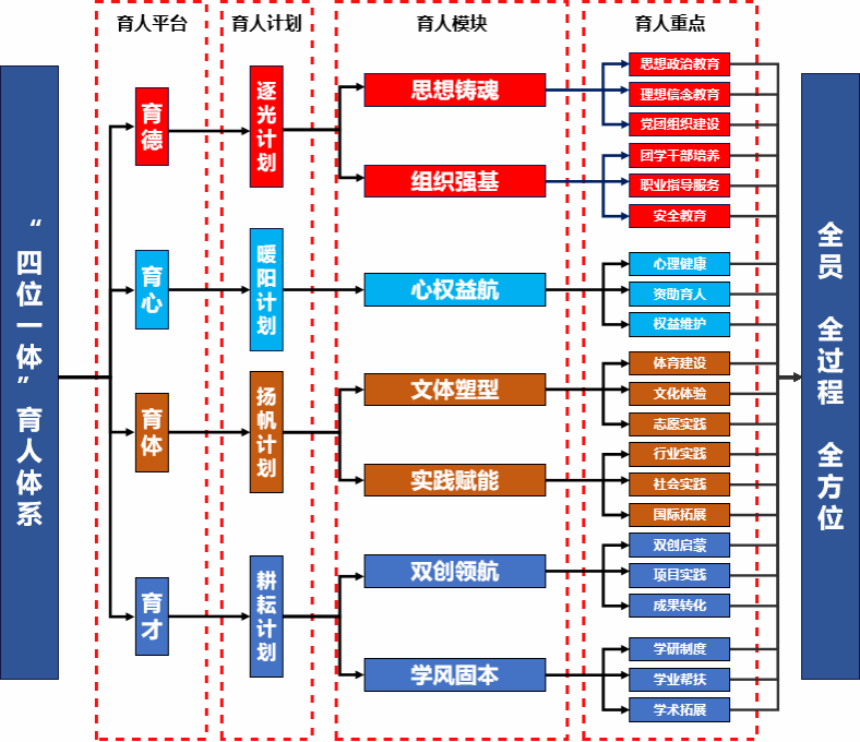 回归教育教学本质,构建“四位一体”育人体系,夯实“育德、育心、育体、育才”思政平台基础,搭建“思想铸魂、组织强基、双创领航、学风固本、心权益航、文体塑型、实践赋能”七大育人模块,形成“纵向贯通成长链、横向激活生态圈”的育人范式,为快猫短视频 卓越人才培养奠定坚实基础。