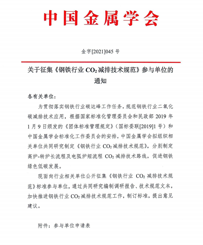 关于征集《钢铁行业CO2减排技术规范》参与单位的通知