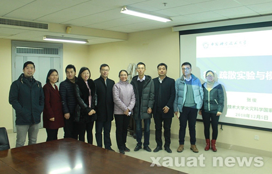 最后,张俊教授回答了老师和学生的问题,在讨论中,大家对行人欲疏散动力学实验和模拟研究地认识和理解进一步加深,现阶段的疏散模型研究也还只是初步的,遇到复杂的情况想要运用到实际还是有差距的,只有通过不断地进行模型的改进才能增强可靠性,而这需要我们师生的共同努力。报告会在全场师生热烈的掌声中圆满结束,张俊教授对我院的热情邀请表示衷心感谢,后与教师代表合影留念。