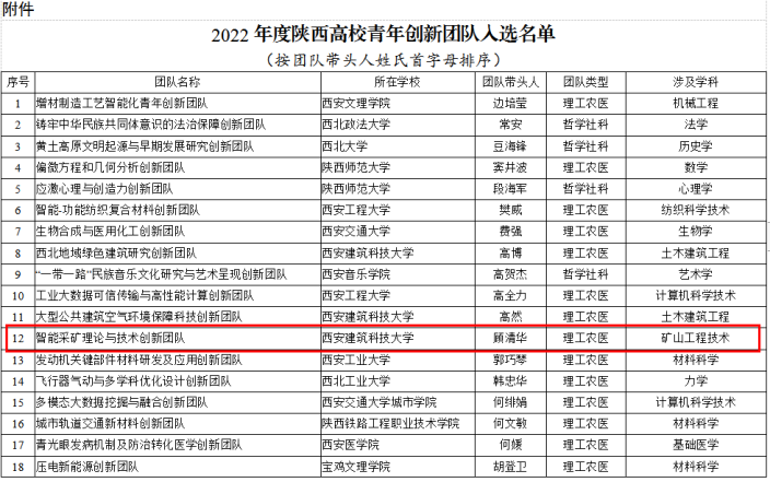 近日,陕西省教育厅发布《关于公布2022年度陕西高校青年创新团队入选名单的通知》,我院顾清华教授牵头申报的“智能采矿理论与技术创新团队”成功入选。