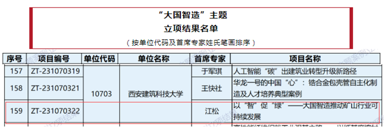 近日,教育部学位与研究生教育发展中心、中国专业学位案例中心公布了2023年主题案例立项名单。本次主题案例征集共设“大国智造”“中华传承”“区域协调发展”“走出去”四个主题。该征集工作经“单位审核推荐”“专家交叉评议”“案例专家委审核确认”三级审核,共有655个项目获批立项。其中,由我院江松教授牵头,卢才武教授、顾清华教授重点参与,联合国内知名矿山企业申报的《以“智”促“绿”——大国智造推动矿山行业可持续发展》(ZT-231070322)项目获批“大国智造”主题立项。