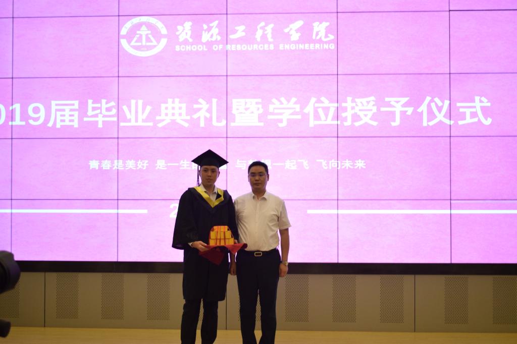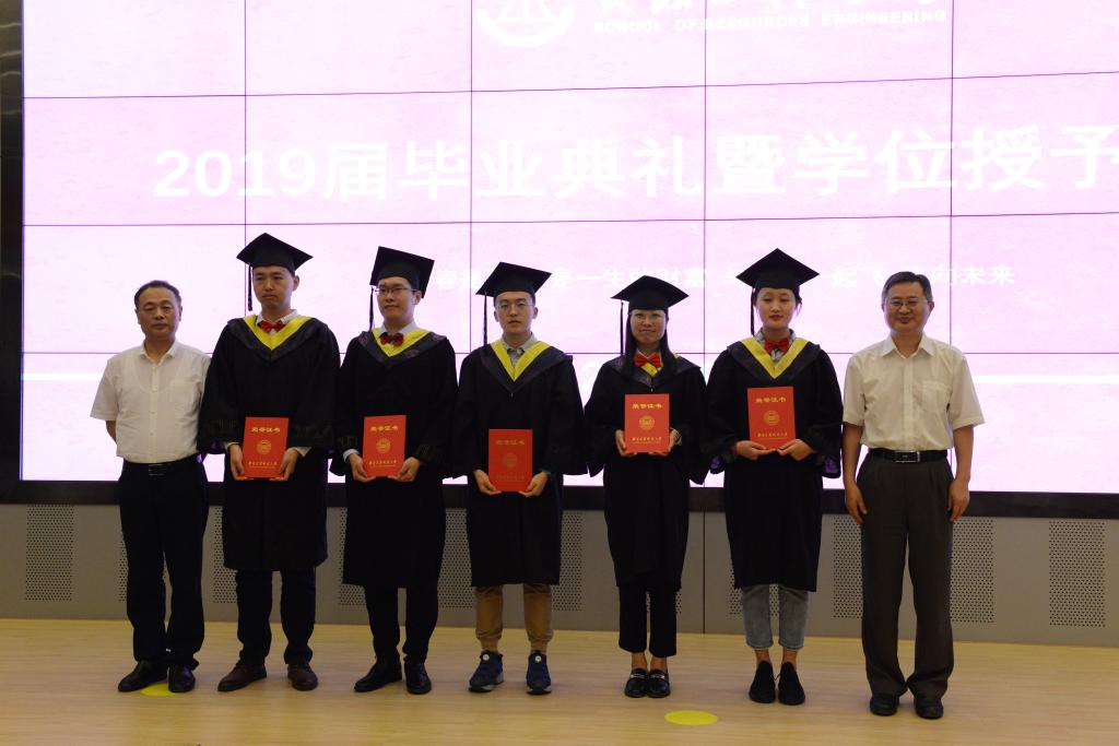 在毕业典礼接近尾声时,毕业生和在校生代表带来诗朗诵《资源,我的爱恋》,表达对学校、学院的深情,并将写满毕业生姓名的纪念册送给学院,院长卢才武代表学院接收了礼物。最后,全体与会师生共同高唱校歌《高举着民族复兴的伟大旗帜》,歌颂母校,感恩母校。