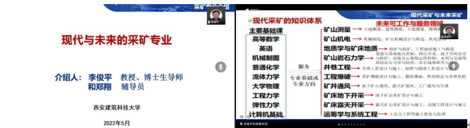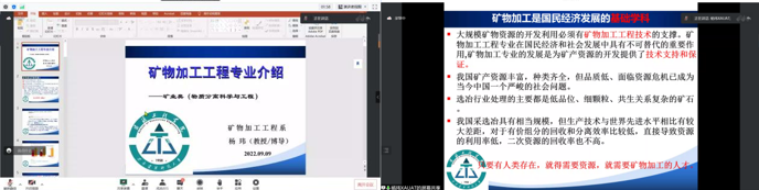 开展2022级矿业类本科生专业分流线上指导宣讲会。本次宣讲会特邀采矿工程系李俊平教授、矿物加工工程系杨玮教授介绍专业特色和发展前景,2022级矿业类本科生全员参与,会议由教学办王豪老师主持。