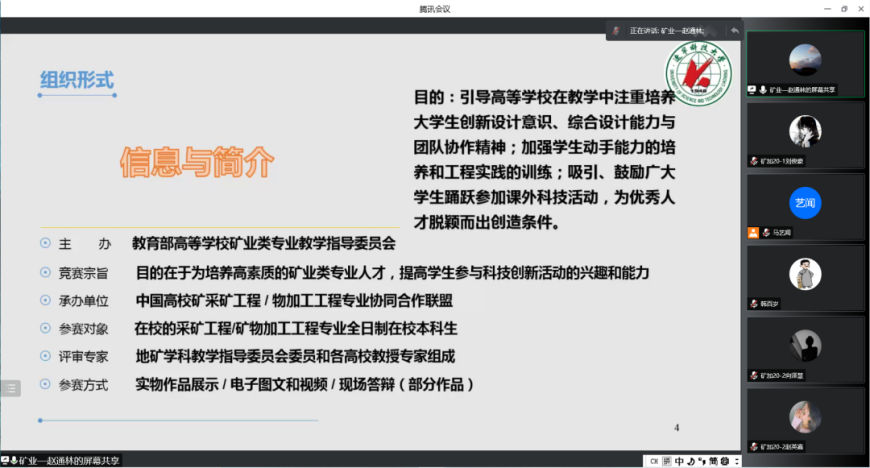工程学院通过腾讯会议线上召开“第七届全国高等学校矿物加工工程专业学生实践作品大赛”动员会,学院领导班子成员、矿加专业全体教师和学生参会。