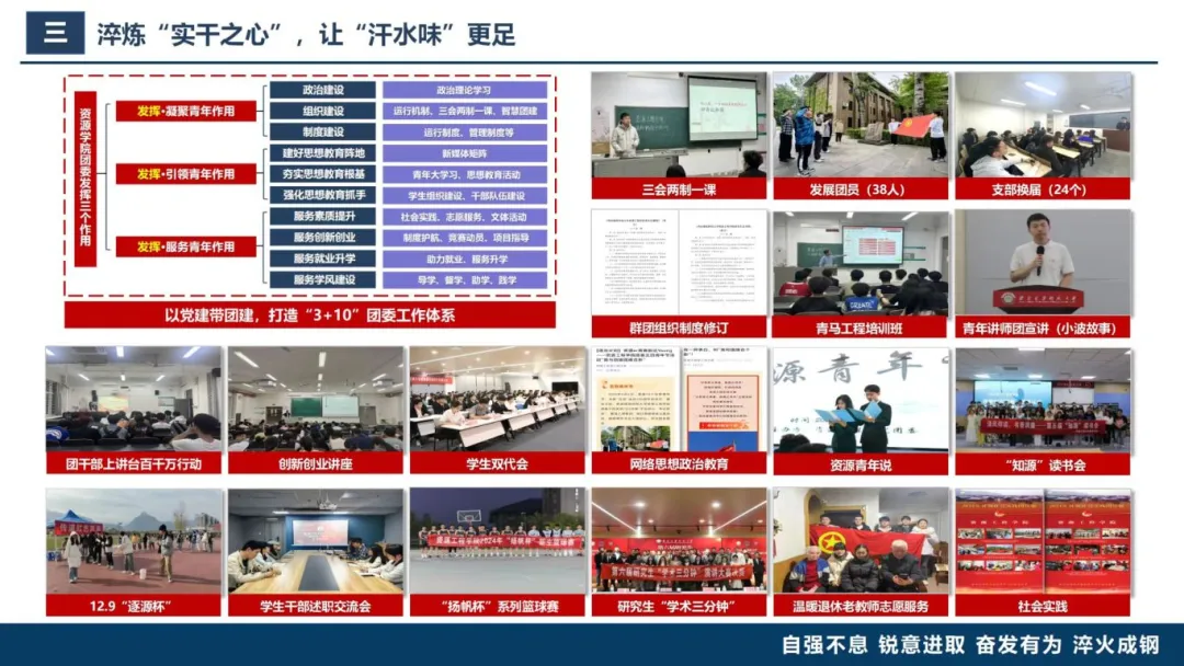 他以“矿业报国”为导向,将学院“四位一体”育人体系与学院团委三个作用发挥融合,不断优化“3+10”团委工作体系。通过强化思想引领、规范基层团务、筑牢网络教育阵地、丰富资源文化、践行志愿精神、驱动双创引擎,发挥共青团思政育人主力军作用,引领资源青年坚定“矿业报国”理想信念,不断推动共青团工作走深走实。过去两年中,学院共青团工作多点开花,实现“中国大学生自强之星科创团体”“陕西省大学生自强之星科创团体”等多个奖项“零”的突破,并连续两年荣获“五四红旗团委”荣誉,他个人也荣获陕西省社会实践先进个人、校优秀教工共青团干部。