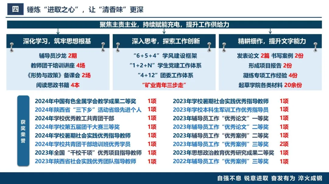 学生工作不仅要“干”字当头,更要“自强不息,锐意进取”。过去一年,他深化学习,筑牢思想根基,多次主动参与辅导员沙龙、团委干部培训,持续赋能充电,提升工作供给力。过去一年,他深入思考,探索工作创新,总结经验,凝练多个工作体系,提出“矿业青年三步走”规划,筑资源青年“矿业报国”梦。过去一年,他精耕细作,提升文字能力,发表思政论文2篇,书写案例2份,起草各类材料20余份。在不断奋进中,让工作散发“清香味”,为学生成长注入清新动力。