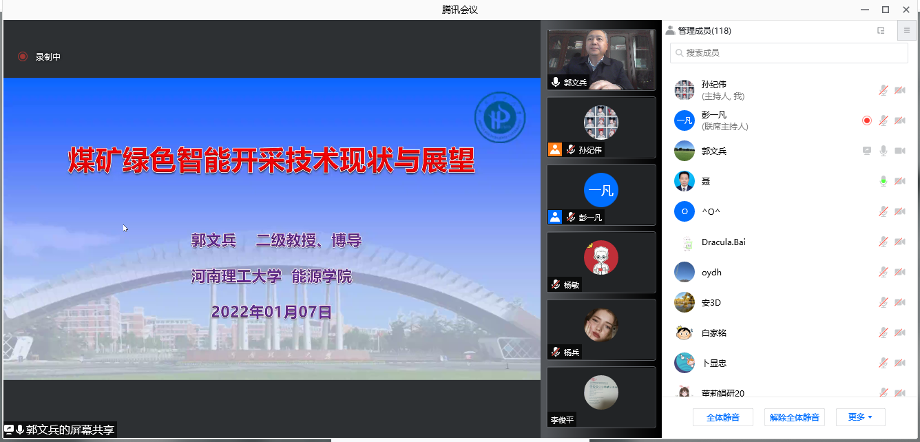 特邀河南理工大学能源科学与工程学院院长郭文兵教授通过腾讯会议作了题为“煤矿绿色智能开采现状与展望”的学术报告会。报告会由聂兴信教授主持,学院采矿、安全专业教师及研究生参加报告会。