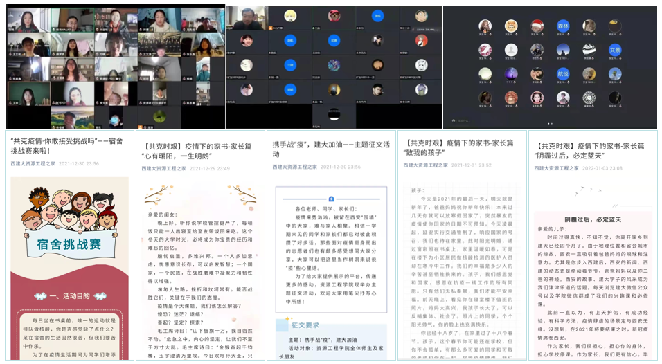 为凝聚师生抗疫心魂,资源学院建立多条心绪、情感交流途径。家书征集活动的开展建立了学生与家长之间的书面情感表达渠道,引导学生写下近期所感所想,也鼓励家长以文字形式与学生交流感情,16份家书,让全体资源学子从中汲取到了坚实力量。与此同时,学院持续强化班主任、导师职责,推进“资源家文化”建设,在2021年最后一天,组织各班班主任、研究生导师、辅导员与学生齐聚网络开展“聚同心·共抗疫·勇担当·展形象”、“云端同心话新年”、“守望相助抗疫情,关心关爱见真情”等主题线上元旦联欢活动,传递了资源亲情与温情。学院也开展了“共克疫情,宿舍运动挑战赛”,以发起运动挑战的形式让学生在锻炼身体的同时实现与同学、老师之间的线上交流,进一步缓解了学生紧张压抑情绪,增加了宿舍生活乐趣。