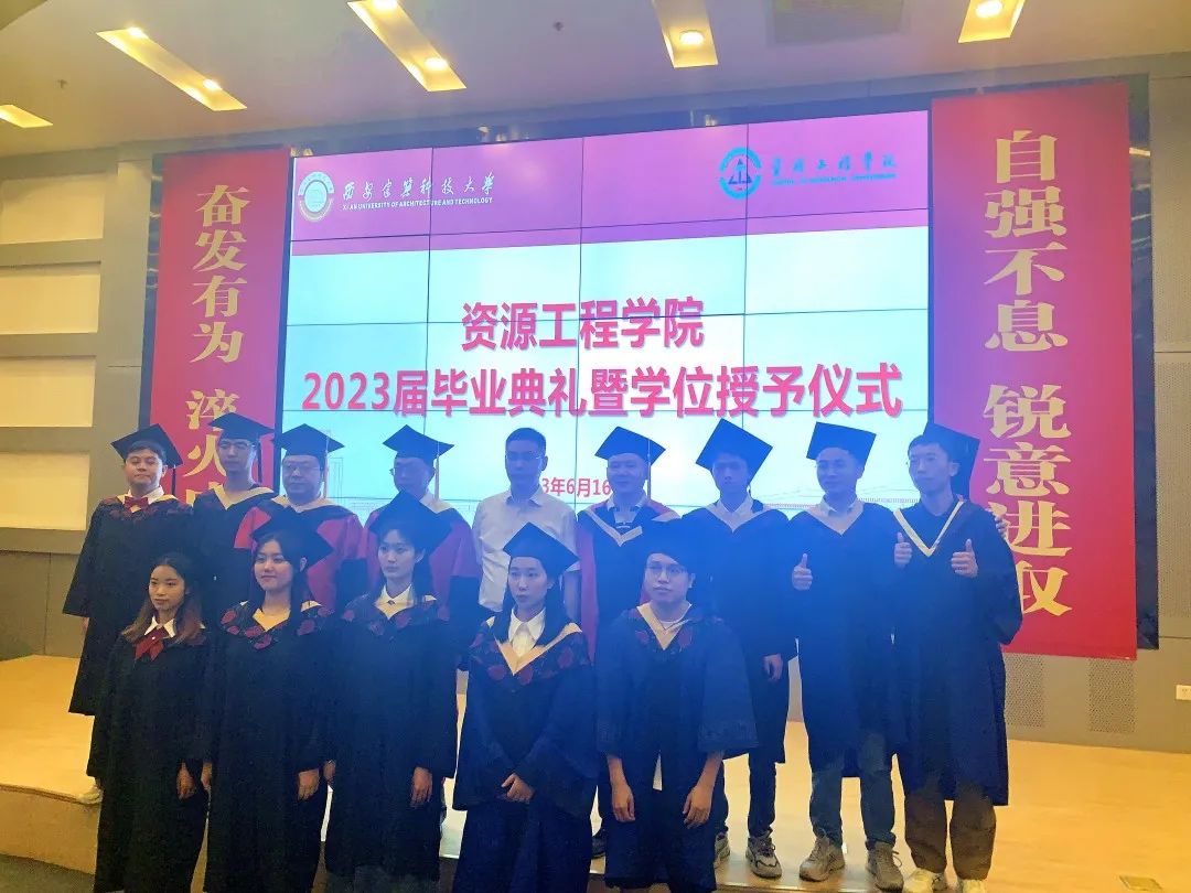 2023届毕业典礼暨学位授予仪式在雁塔校区工科楼一楼报告厅举行。西安优迈智慧矿山研究院有限公司总经理翟文斌、华清集团原总经理刘荣、河南博奥资源咨询有限公司董事长王付民、校董校友会(教育基金会)办公室鲁莉、学院领导班子成员、学位评定分委员会委员、全体教师和2023届全体毕业生及在校生代表,共计300余人参加了本次活动,典礼由学院党委副书记、副院长李枚阳主持。