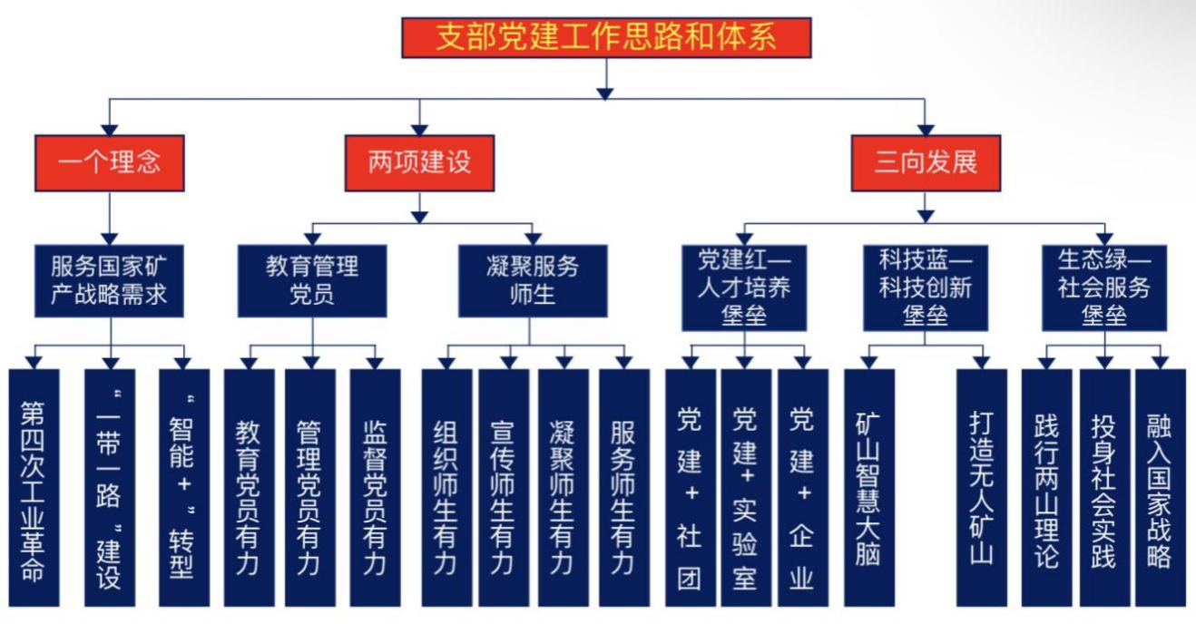 矿山智能科学与工程师生联合党支部始终坚持学院党委领导,认真贯彻落实“七个有力”工作要求,充分结合支部发展实际、行业发展形势、国家战略需求,搭建“1+2+3”党建体系,通过党建、学术互联互通推进特色学术支部建设,实现党建和科研发展的双向提升。