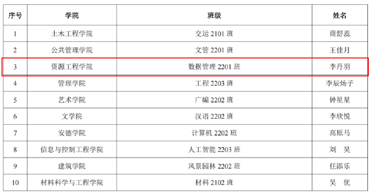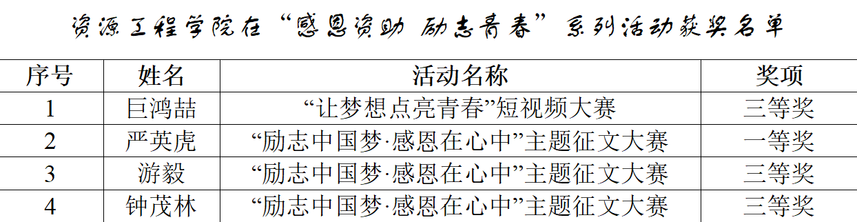 近日,由学生工作部(处)公示的“感恩资助 励志青春”系列活动获奖名单中,在“让梦想点亮青春”短视频大赛活动中,由学院辅导员贾开发指导、数据管理2302班巨鸿喆和黄丽娜等同学制作的《青春助梦新时代 资助伴我向未来》短视频荣获三等奖1项;在“励志中国梦·感恩在心中”主题征文大赛,安全2303班严英虎荣获一等奖1项,安全2303班钟茂林、数据管理2302班游毅荣获三等奖2项。