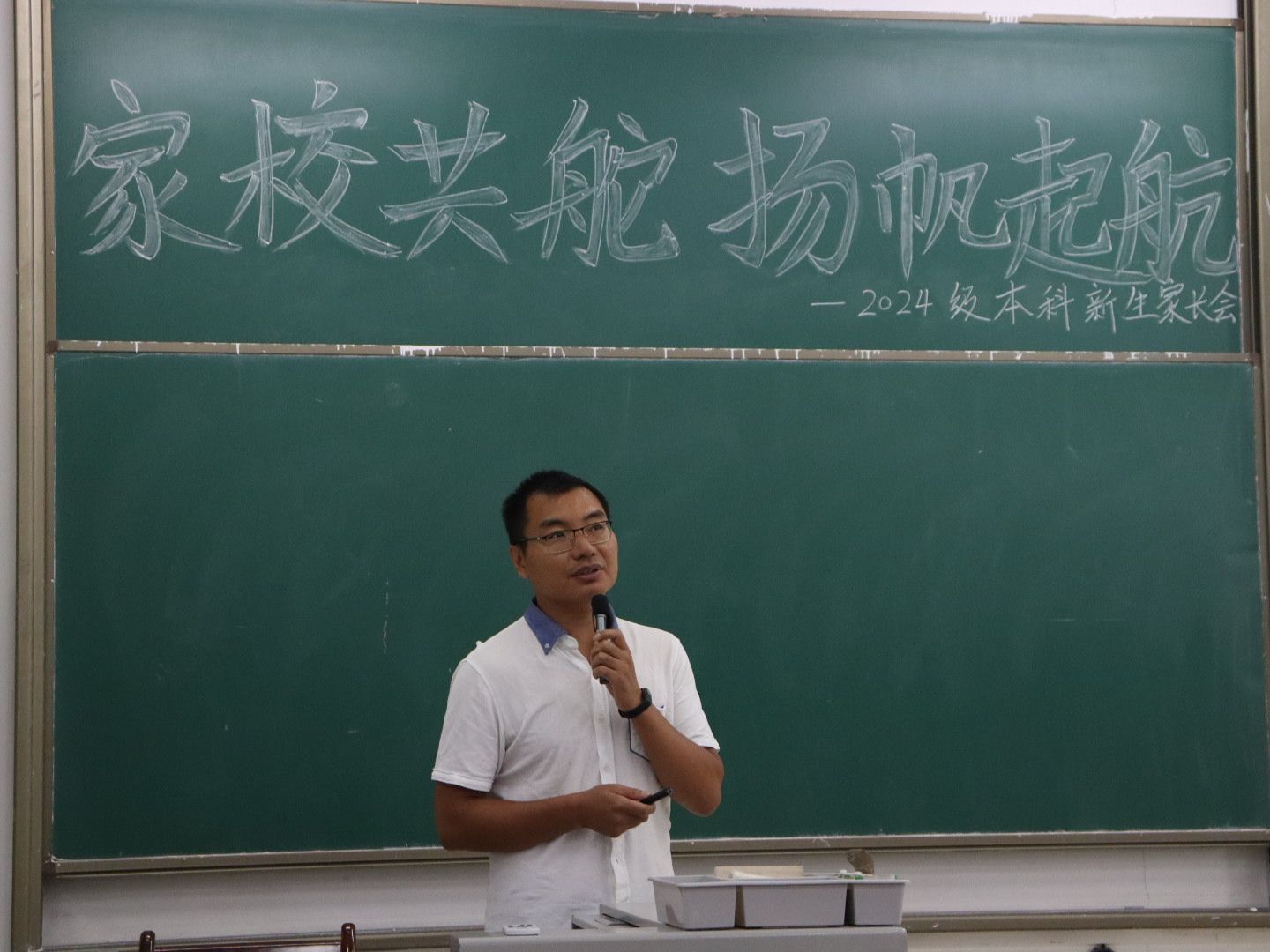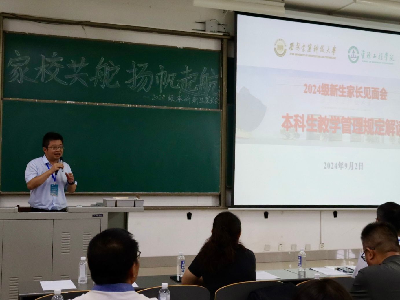 于草堂校区学府城12-101举办2024级本科新生家长见面会。院党委书记张佩、副院长顾清华(主持工作)、院党委副书记、副院长李枚阳、副院长郭进平、副院长卜显忠、校心理素质拓展与咨询中心王平、新生班主任及家长参加会议。会议由2024级新生辅导员胜奕铭主持。