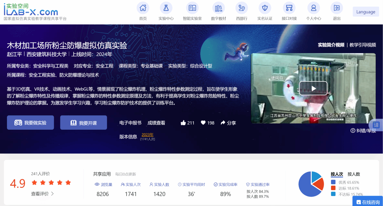 本课程依托 3D 仿真、VR 技术、动画技术、WebGL 等前沿技术,以生动情景化的方式展现粉尘爆炸机理及粉尘爆炸特性参数测定过程。借助这一虚拟仿真实验平台,学生既能直观感知木材加工场所的粉尘产生及通风除尘系统,深入理解粉尘爆炸机理及传播规律,掌握粉尘爆炸特性参数测定实验装置的组成、工作原理和测定方法,学会计算粉尘爆炸最大爆炸压力上升速率和爆炸指数,也能了解粉尘爆炸预防与控制原理,初步具备粉尘爆炸场所隐患排查能力,为解决粉尘防爆等复杂问题筑牢基础。同时,课程着力提升学生结合通风除尘系统参数、粉尘爆炸特性测定结果进行粉尘防爆设计的知识运用能力,锻炼其知识应用、综合实践、思维判断与分析、跨学科思维及对新技术的学习能力,培养团队协作意识、创新精神和科学严谨的工作态度。此外,课程以国家安全发展需求的防火防爆科学问题为导向,综合运用多学科理论知识和虚拟仿真实验技术,在助力学生提升科学素养的同时,推动其实现个人成长与国家发展的同频共振。作为对传统教学的有效补充,该虚拟仿真实验课程为学生打造了安全、高效、可重复的实验学习平台,让学生能身临其境地感受木材加工场所的实际环境,操作各类设备,深入理解粉尘爆炸风险及防控措施,进而极大提高学习兴趣和独立操作实验的能力。