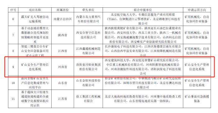 矿山智能科学与工程团队,联合洛阳栾川钼业集团股份有限公司等单位联合申报的“矿山安全生产管理信息化系统”项目,经企业申报、地方初审、专家评审、现场实地评审、公示等程序,成功入选第一批“安全应急装备应用试点示范工程”。